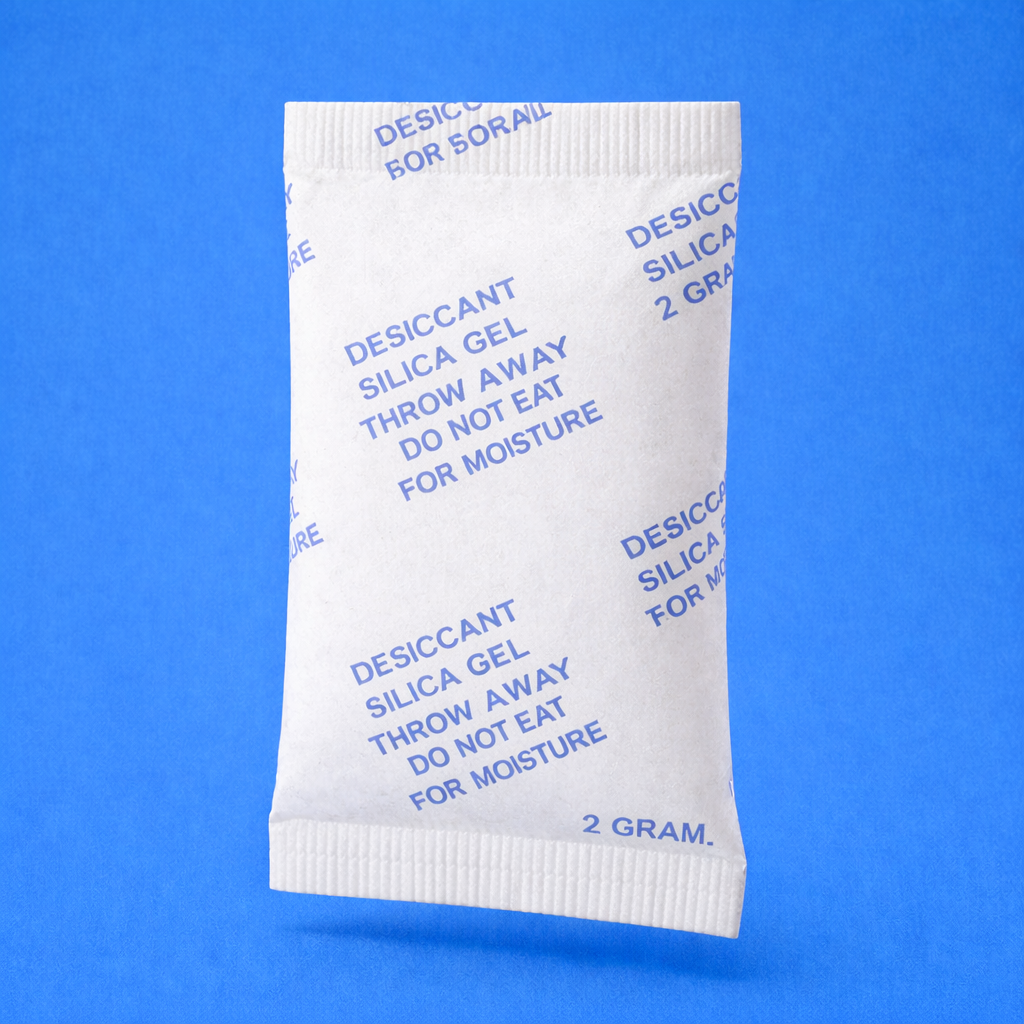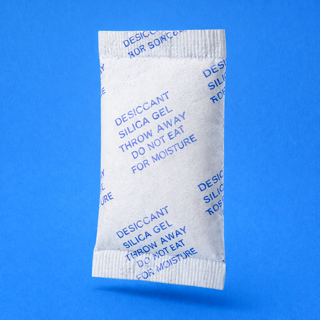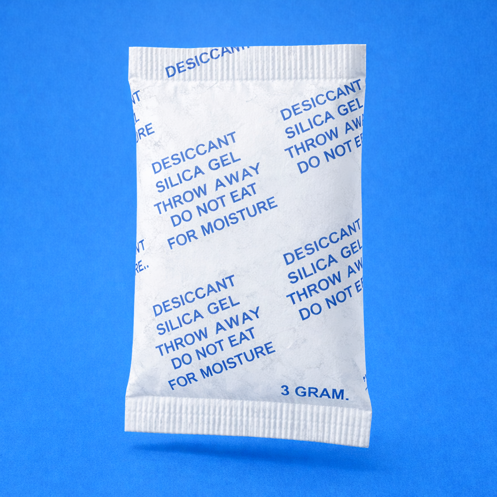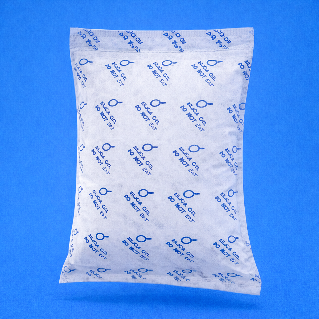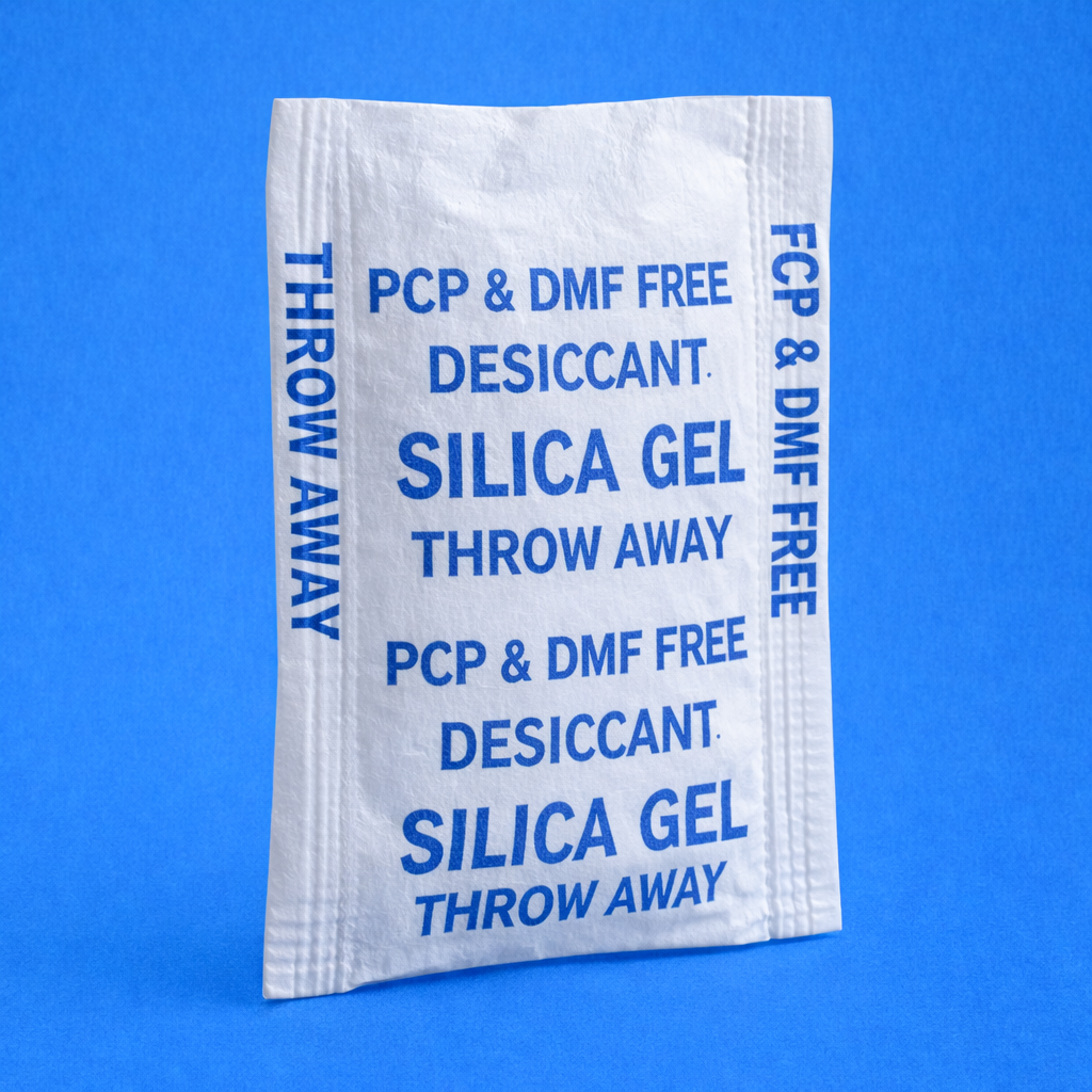 Silica Gel Blue Pouches contain indicating silica gel that changes color upon moisture absorption, allowing easy monitoring of desiccant saturation.